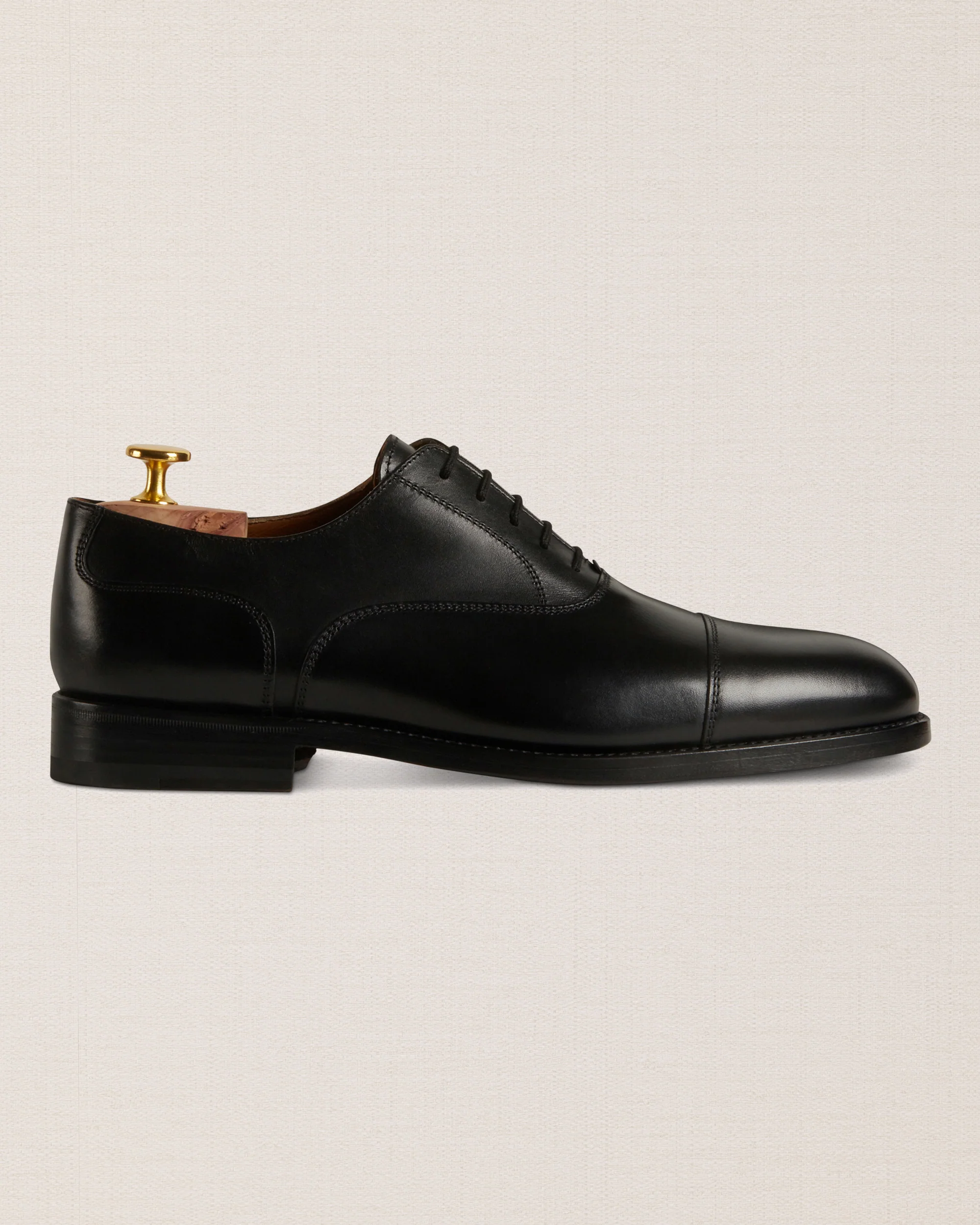 It's an artisanal Oxford with a subtle and versatile elegance, made to never fail. With its full-grain leather, leather sole, and classic aesthetics, it will remain timeless. The opaque black shoe is perfect for your first day at work or formal occasions, such as a 21st birthday, graduation party, or your best friend’s wedding. And its blake-rapid construction makes it easy to resole.