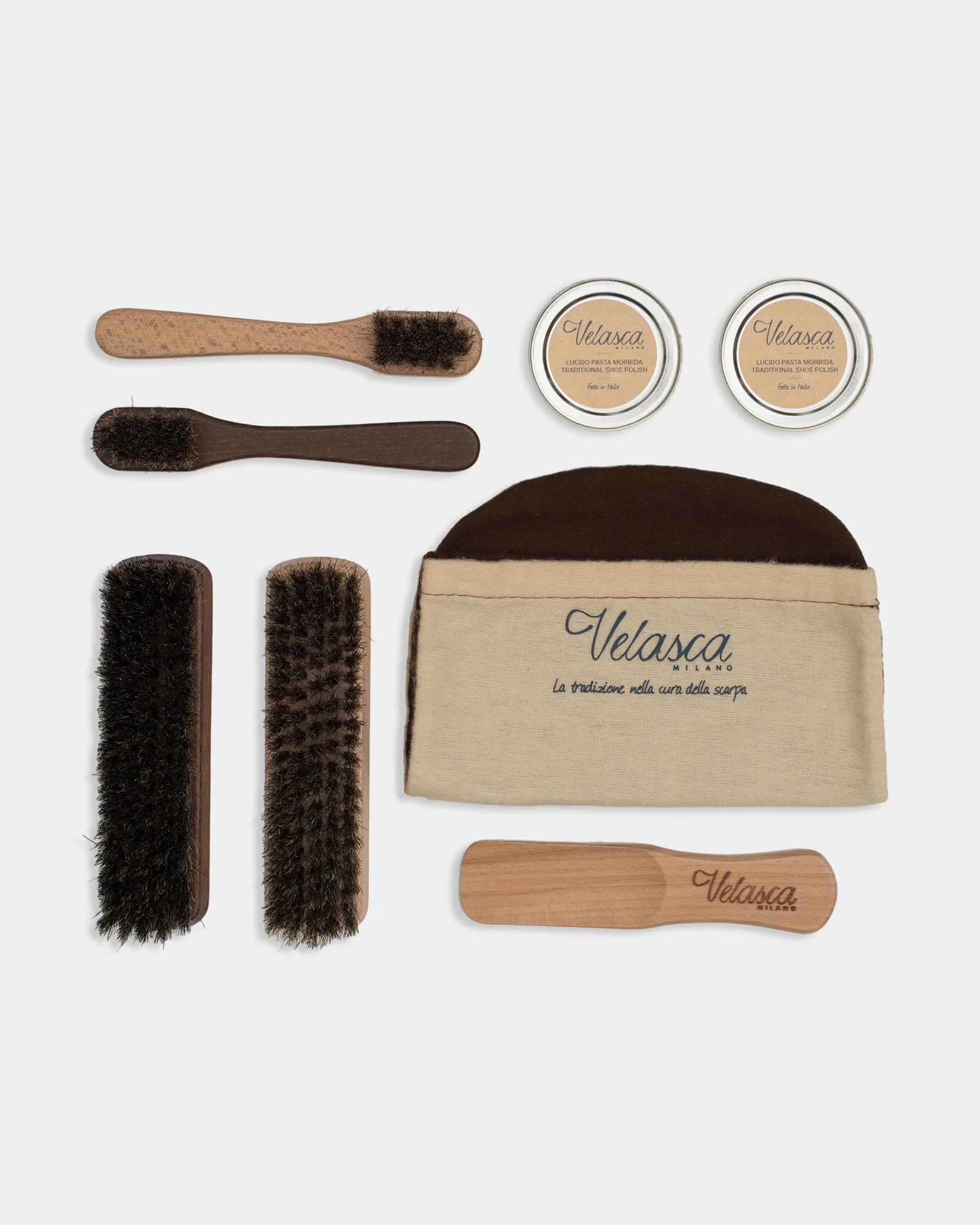‘Lustrà’ is the shoe care kit for men’s brown full-grain leather shoes. It includes eight accessories that are (as with all our products) made totally in Italy. Brushes, polishes, a wooden shoe horn and a glove: everything you need to clean your artisanal shoes.
