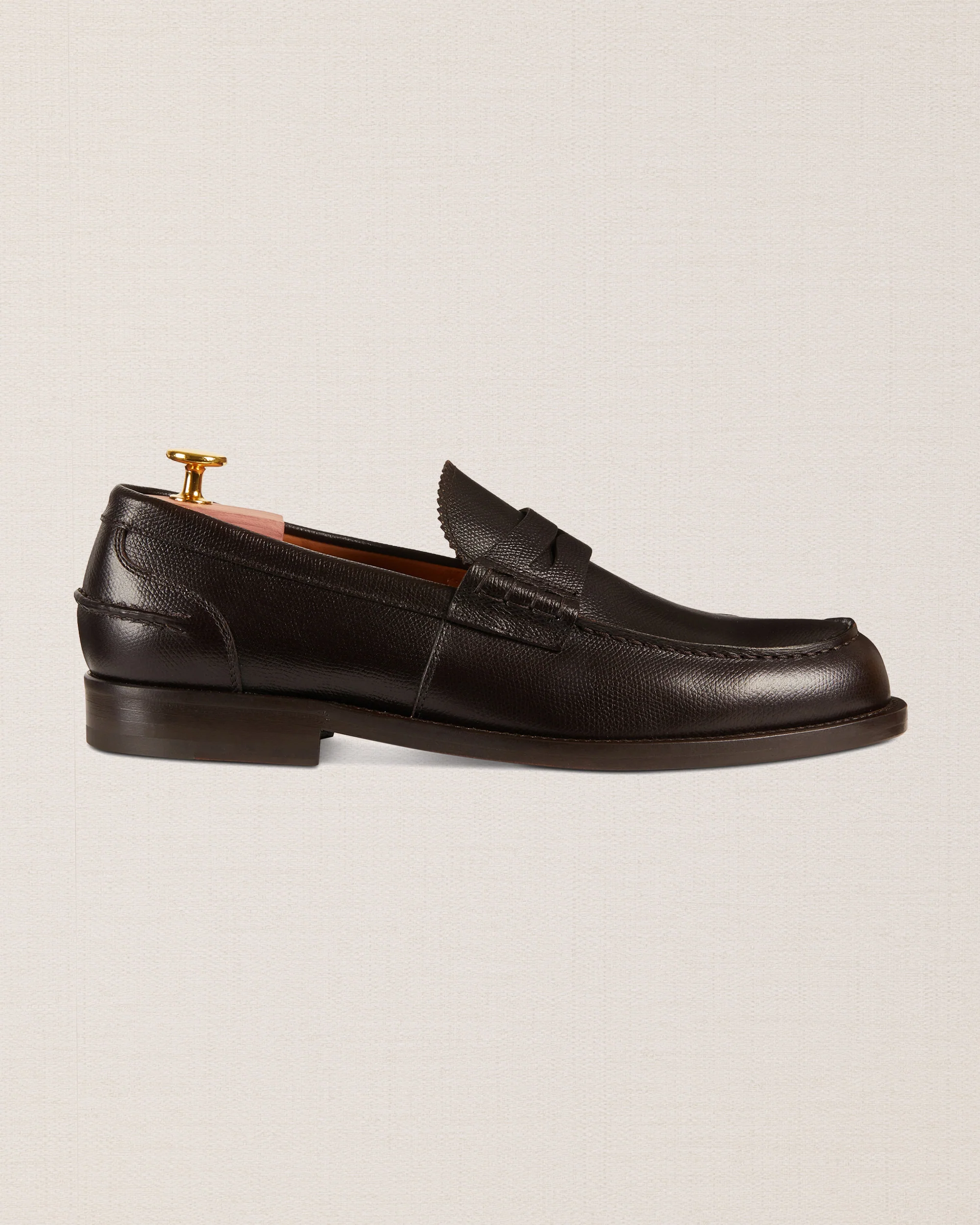 It's a Penny Loafer with the most character and elegance of the collection. With its tumbled leather, no laces, and leather sole, it’s a very versatile, light and comfortable dark brown shoe. It’s very light as if you would wear a pair of slippers.