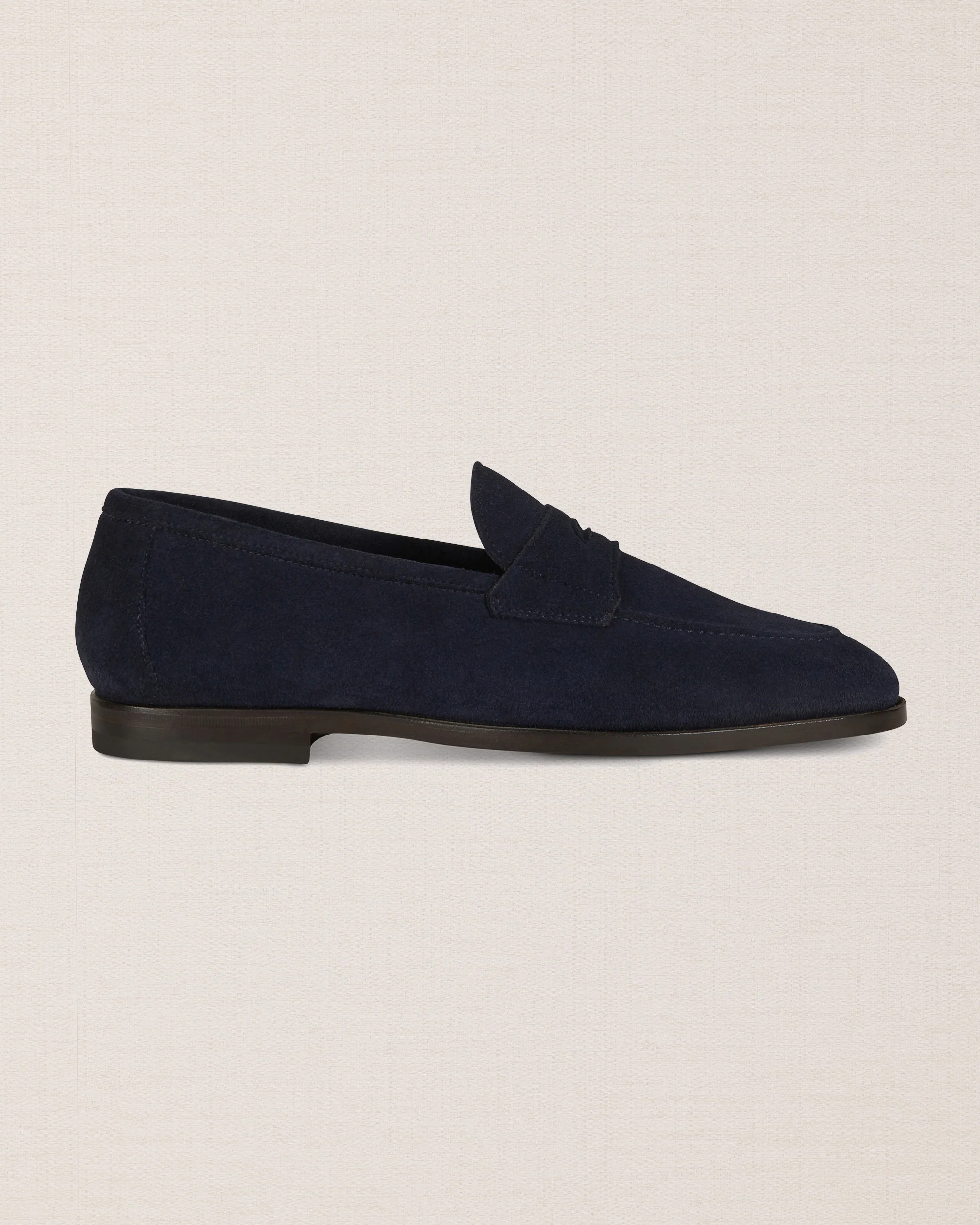 College shoes with a mask, which stretches towards the tapered tip in soft suede calf leather. The unlined interior welcomes the foot without the need for socks. The sole is in classic leather. You can wear your blue moccasins with a cream-coloured cotton and linen unlined blazer, a shirt and jeans. There is a sea breeze out there: a panama hat on your head and enjoy a walk in the warm sunset.