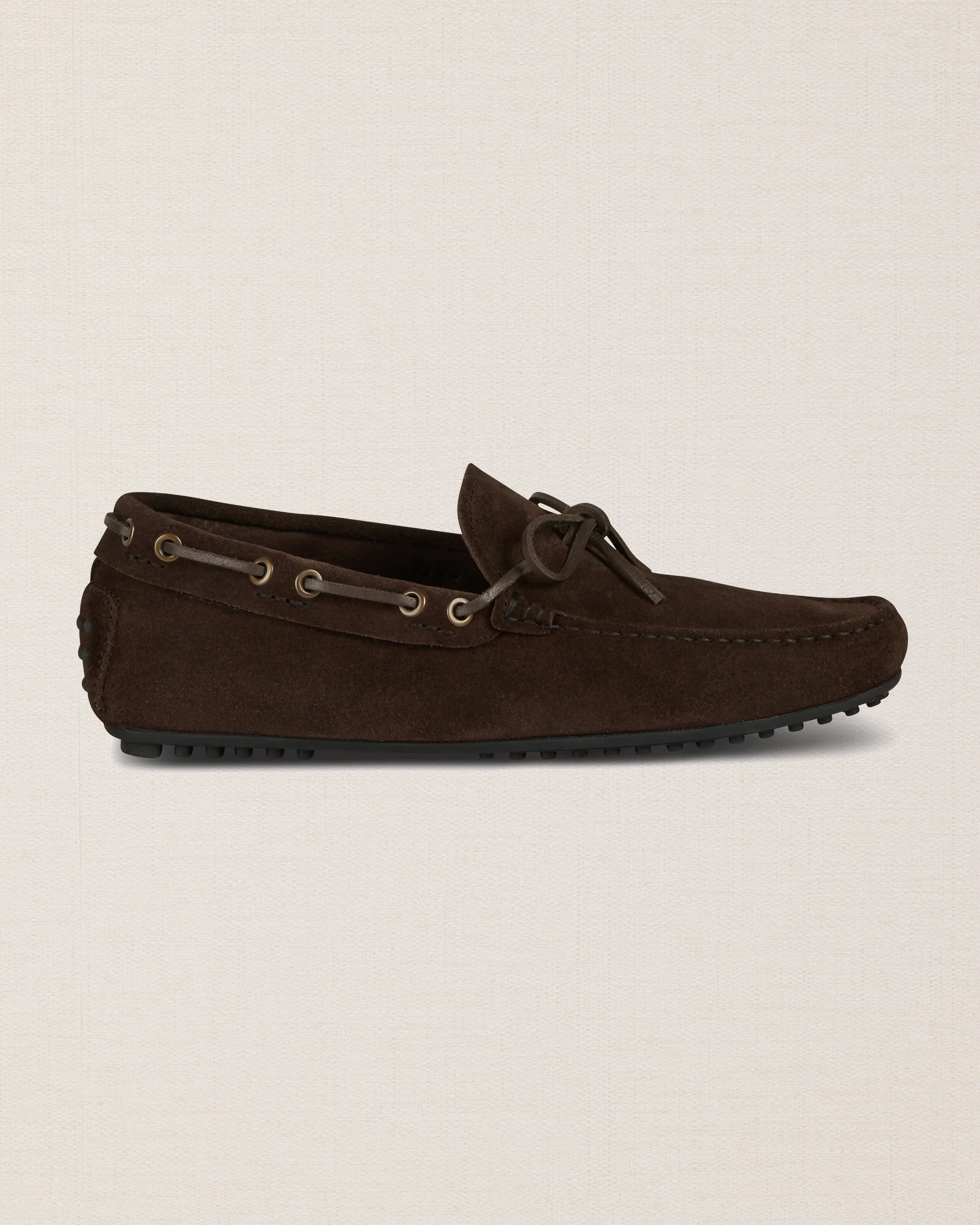 There aren't your typical studded-sole Moccasins with laces. Their rubber soles run the whole length of the shoe, making them somewhat solid. We gave them a new soul, but their lines remain iconic: the laces wrap around the foot and fall casually onto the upper. In suede calfskin, you can wear them with a blue cotton turtleneck sweater, an Oxford shirt and a pair of pale jeans. Always without socks. Perfect for weekends out of town when days are ever warmer.